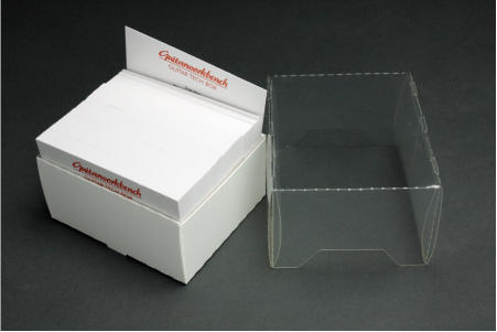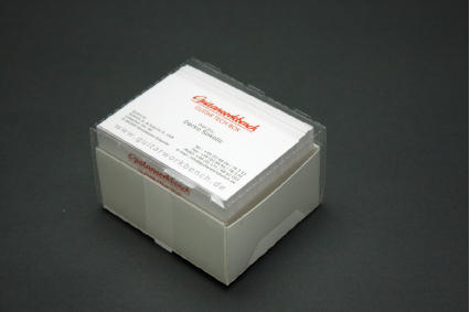 Für ca. 250 St. Visitenkarten imScheckkartenformat 85x55mm(Die Visitenkarten werden hochkantstehend verpackt).Innenmaße: 87 x 70 x 56 mmVerpackungseinheit: KartonKartoninhalt: 100 Böden + 100 Deckeln
